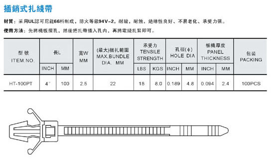4、標牌式尼龍扎帶采用UL認可尼龍66料制成,防火等級94V-2,耐酸蝕,不易老化。 特點:扎帶前端設有空白標牌,可用油性筆在上面標志記號。